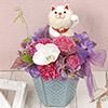 秋らしい紫色のお花がはいった、花の招き猫のフラワーギフト。