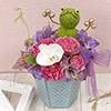 秋らしい紫色のお花がはいった、花かえるのフラワーギフト。