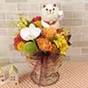 オレンジ系の秋らしいお花がはいった、招き猫のフラワーギフト。